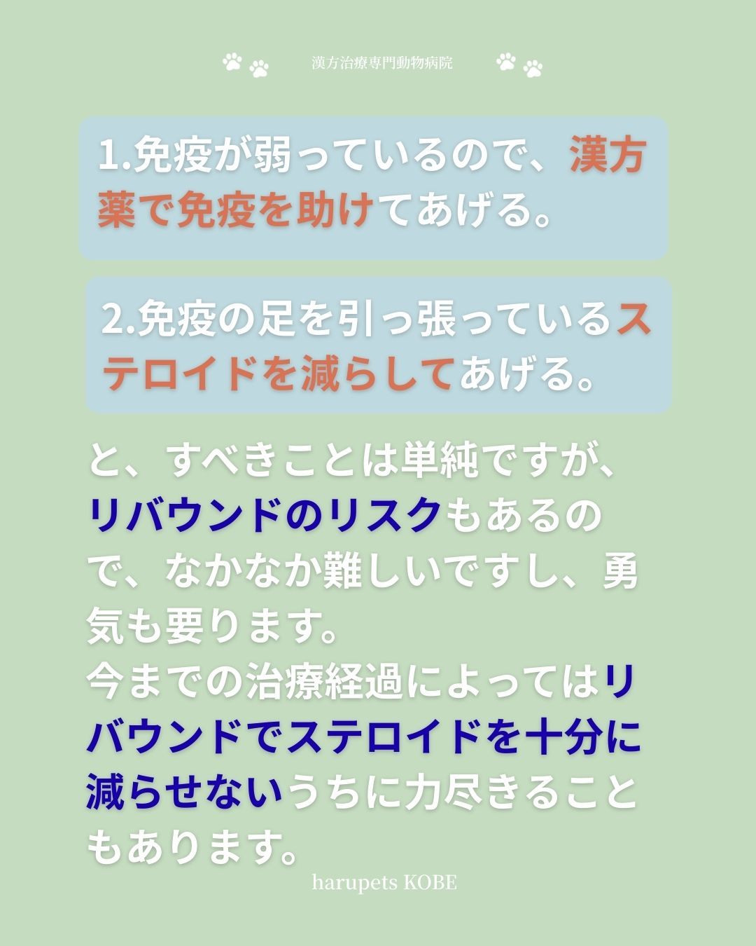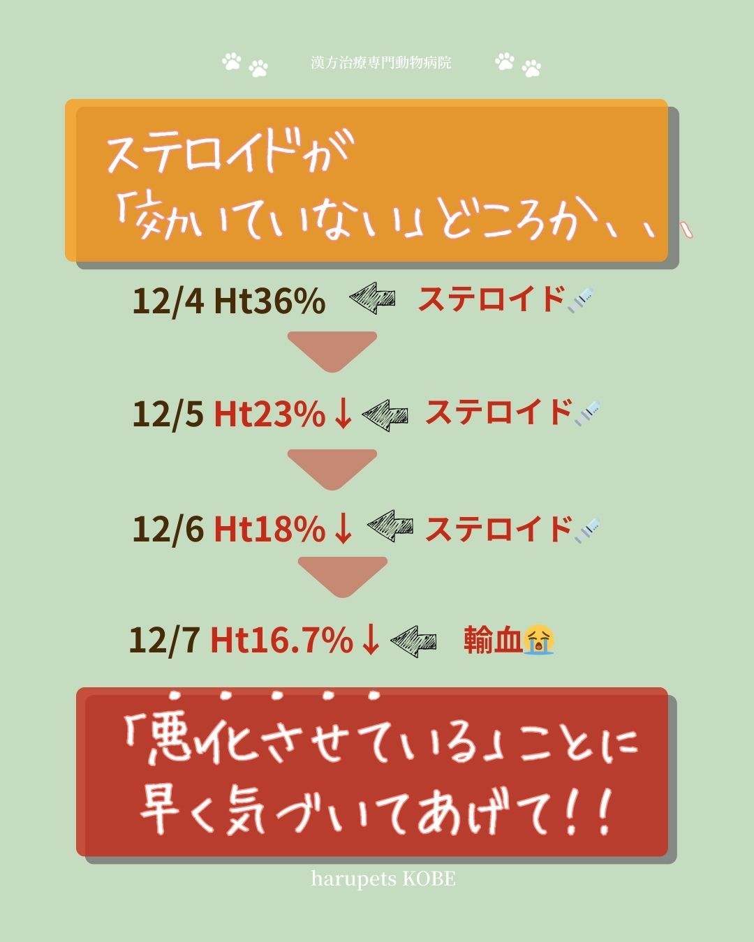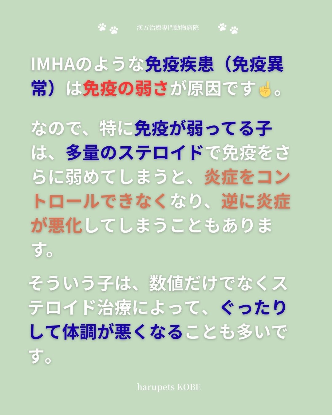 IMHAのような免疫疾患(免疫異常)は免疫の弱さが原因です。なので、特に免疫が弱ってる子は、多量のステロイドで免疫をさらに弱めてしまうと、炎症をコントロールできなくなり、逆に炎症が悪化してしまうこともあります。そういう子は、数値だけでなくステロイド治療によって、ぐったりして体調が悪くなることも多いです。