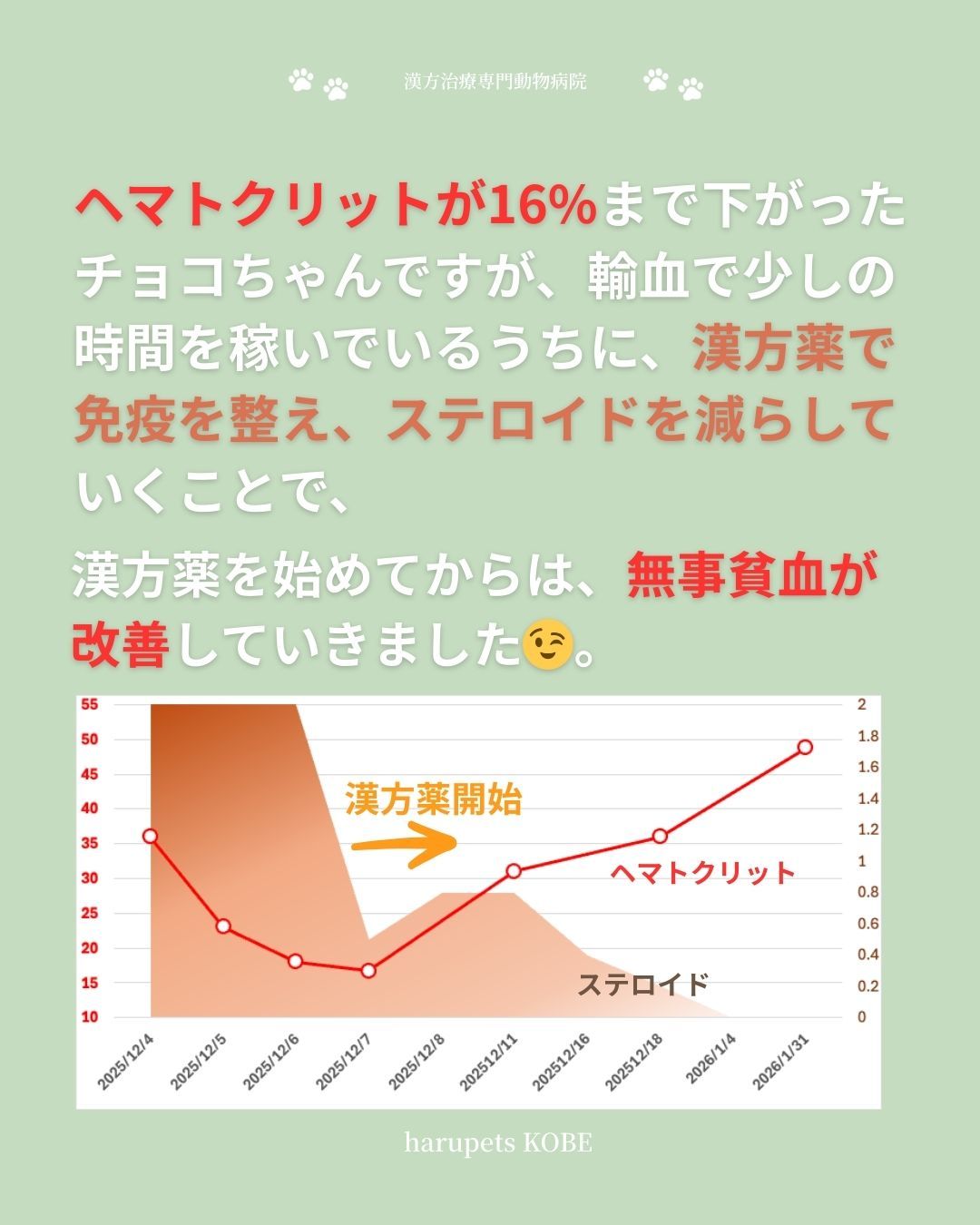 ヘマトクリットが16%まで下がったチョコちゃんですが、輸血で少しの時間を稼いでいるうちに、漢方薬で免疫を整え、ステロイドを減らしていくことで、漢方薬を始めてからは、無事貧血が改善していきました。
