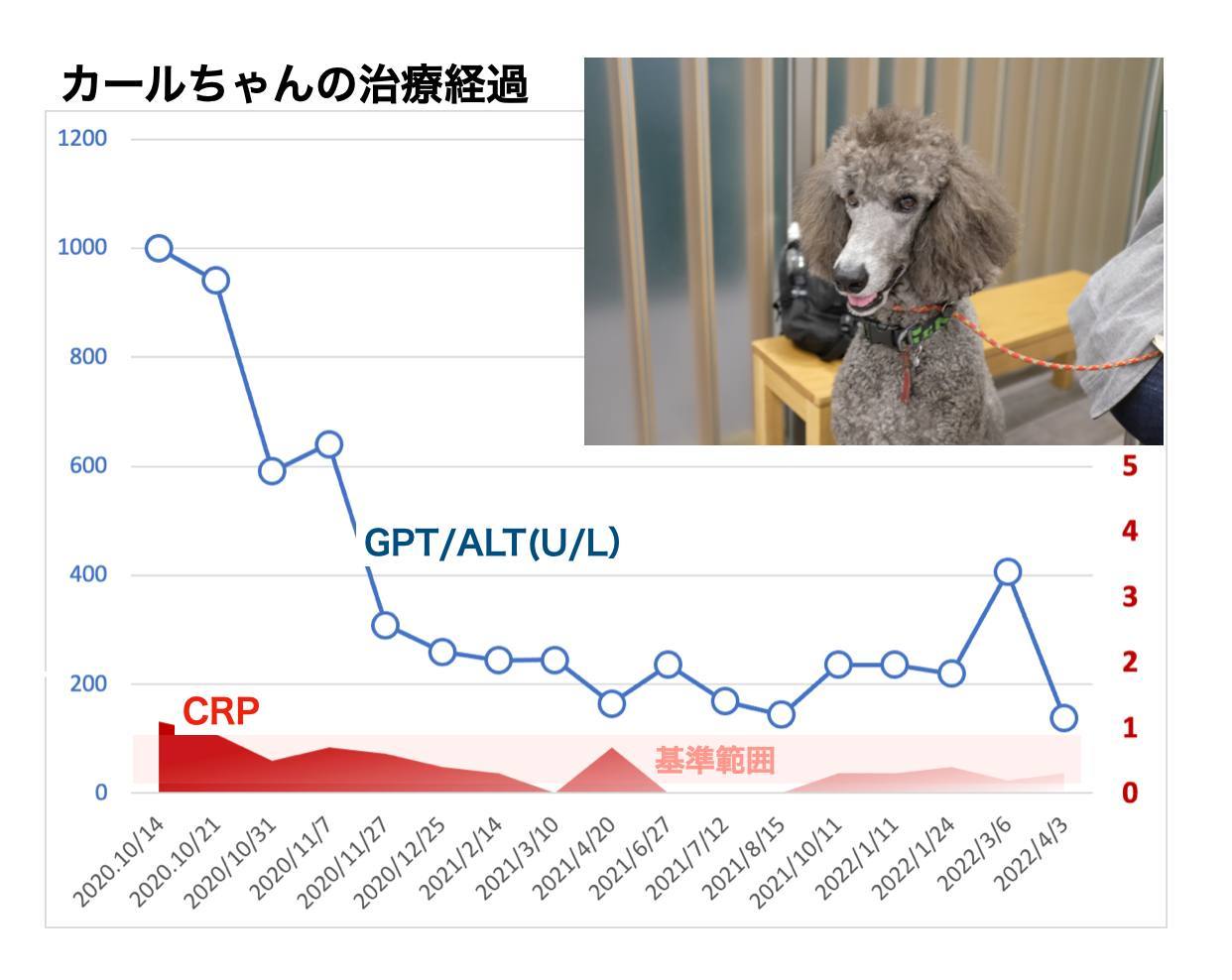 ALP(GPT)や AST(GOT)が上昇する 肝炎 の治療はやはり字の如く肝臓の炎症なので、炎症を抑えることができなければ、利胆剤 やビタミン剤を使ってもなかなか改善してくれないことが多いです。しかし、西洋治療で炎症を抑える薬はステロイドや免疫抑制剤など肝臓や免疫に負担をかけるものしかないので治療に困ることが多いです。特に数値が著しく上昇したり、#黄疸 を伴うような強い炎症がある場合は、ステロイドを使わなければ炎症を抑えられないですが、その副作用でまた肝障害が悪化してしましまいます。しかし、肝機能を改善しながら炎症の治療ができる漢方薬治療は、急性及ぼ慢性肝炎の治療にもよく効いてくれることが多いです。ラバーちゃんは漢方薬治療で肝臓の数値は改善していき新記録を更新中です。カールちゃんも黄疸になってから、肝臓の数値はずっと高くて測りきれませんでしたが、漢方薬を始めてから改善してきてくれました。